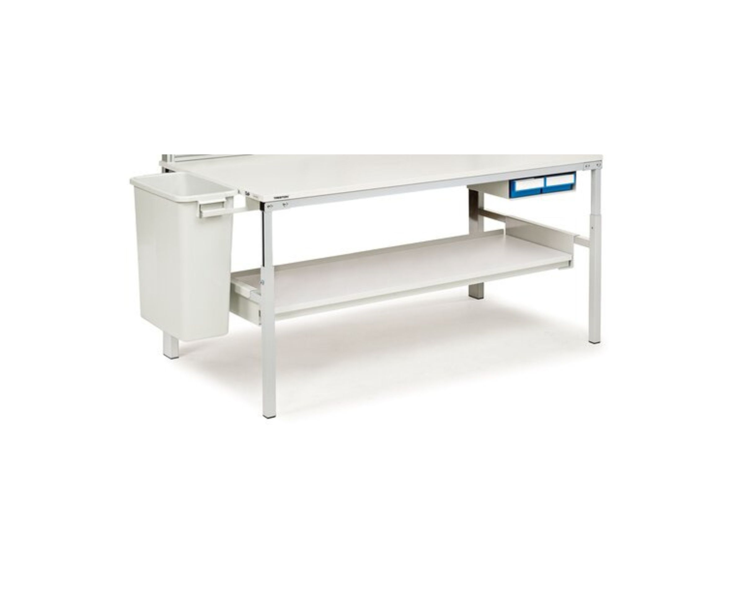 TP/TPH/TPB-borden är utrustade med en laminatbänkskiva under bordsskivan på horisontella skenor.