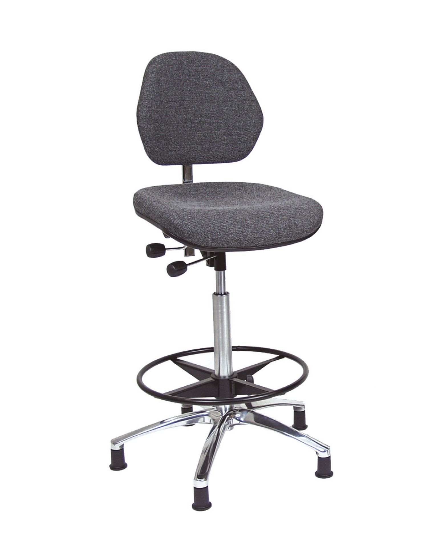 Arbetsstol utformad för elektronikindustrin. Det mörkgrå klädseltyget är tillverkat av högkvalitativt material som skyddar mot statisk elektricitet. Standard 5-punkts fotstöd med glidstift. Höjdjustering med gasfjäder.