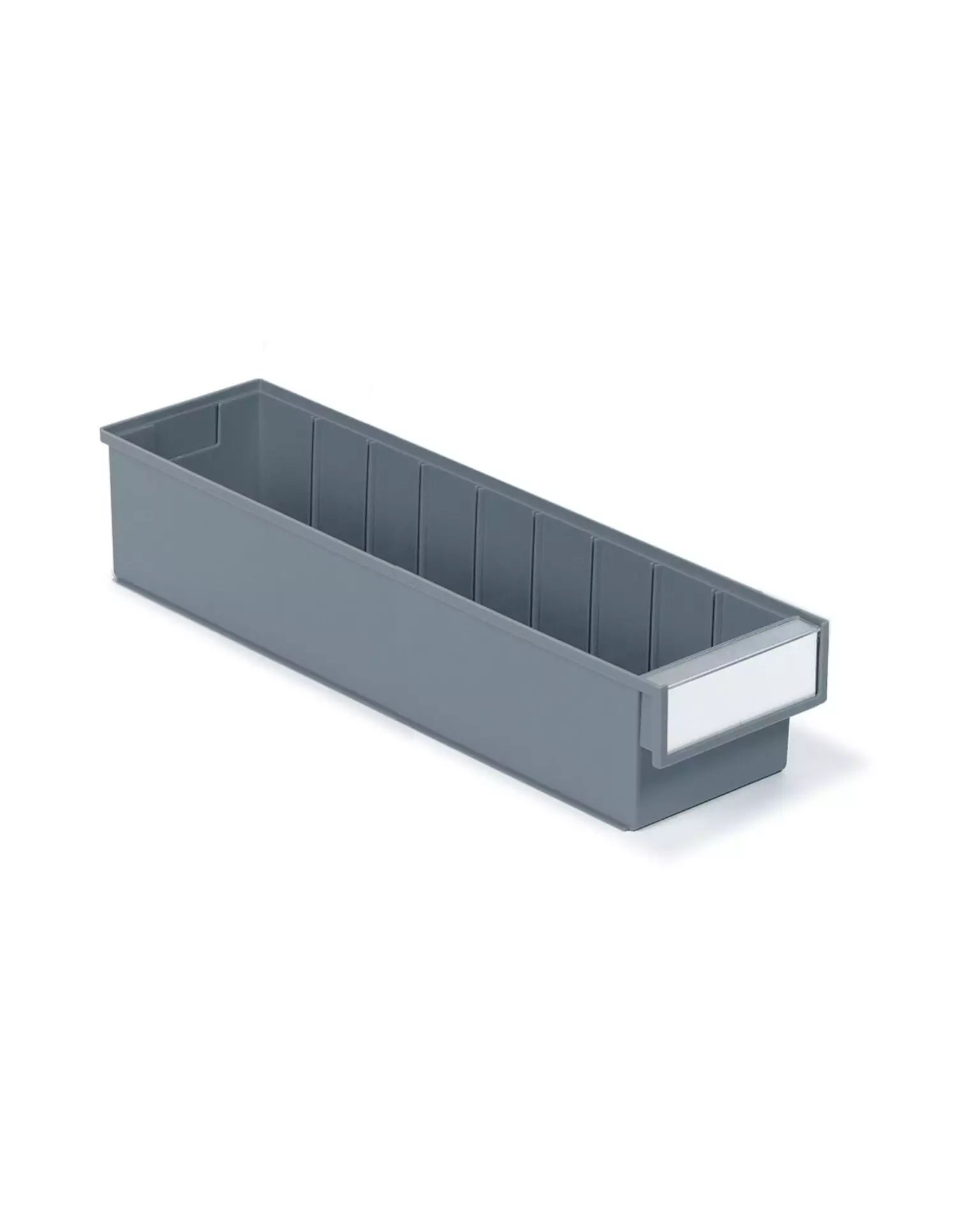 Inhemsk och robust Treston-hyllbox för småförvaring. Plockvänlig, stapelbar hyllbox med korrugerad botten och skyddad etikett. Tvärgående plastavdelare finns som tillval.