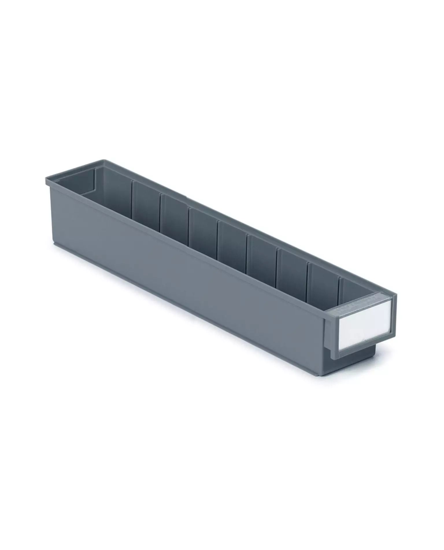 Inhemsk och robust Treston-hyllbox för småförvaring. Plockvänlig, stapelbar hyllbox med korrugerad botten och skyddad etikett. Tvärgående plastavdelare finns som tillval.