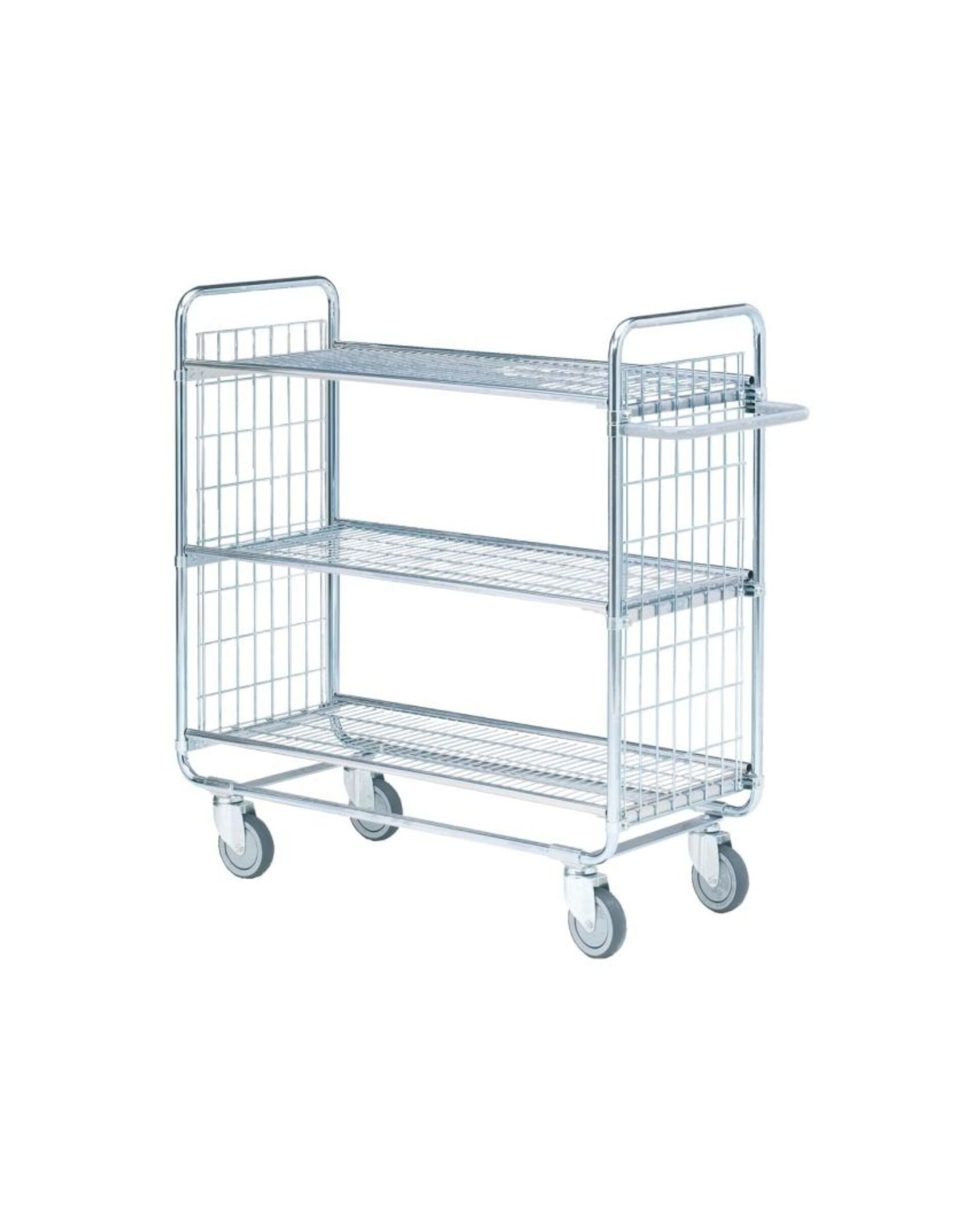 En mångsidig och praktisk uppsättning hyllvagnar. En utmärkt lösning för mångsidig förvaring, industri, kontor och catering. Alla hyllplan och skjuthandtaget är justerbara i höjdled. Vagnarna har näthyllor och en ram av galvaniserat stålrör.