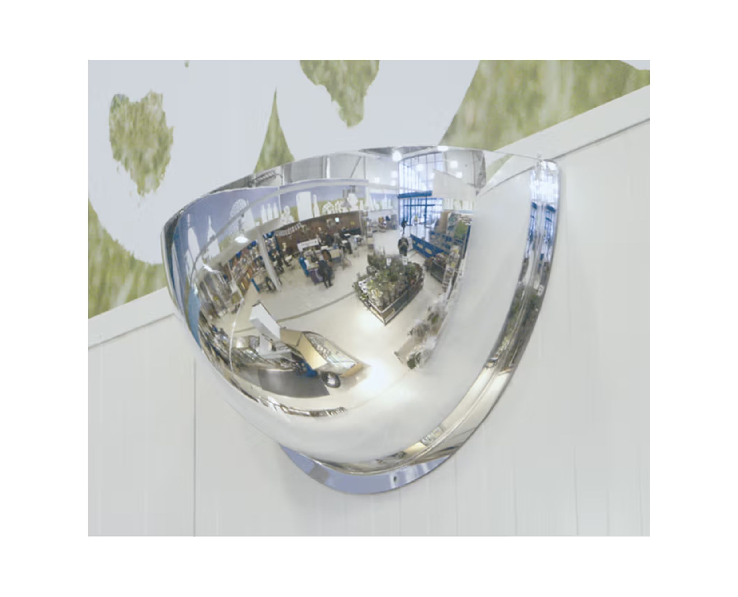 Slitstark kupolspegel med 180 graders synfält. Idealisk för lager och butiker. Övervakningsområde 600 mm spegel 1-15 m2, 800 mm spegel 15-20 m2 och 1000 mm 20-30 m2.