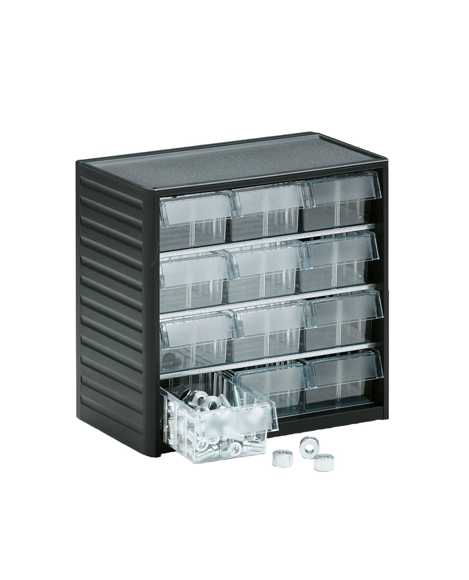 Små förvaringslådor av hög kvalitet för professionellt bruk. Lådställen kan ställas på ett bord, skruvas fast på väggen, staplas på svängbara ställ eller på lådställ. Ram i formgjuten polypropen, hyllplan i galvaniserad stålplåt, lådor i klar polystyren. Satsen levereras med sju olika lådställ.