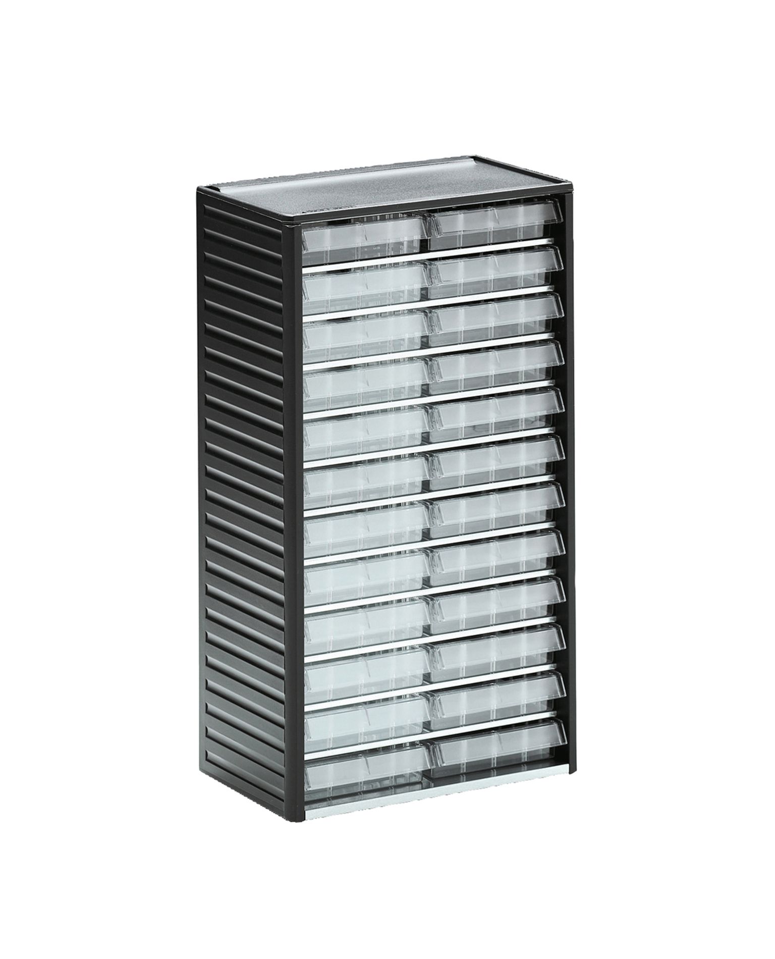 Små förvaringslådor av hög kvalitet för professionellt bruk. Lådställen kan ställas på ett bord, skruvas fast på väggen, staplas på svängbara ställ eller på lådställ. Ram i formgjuten polypropen, hyllplan i galvaniserad stålplåt, lådor i klar polystyren.