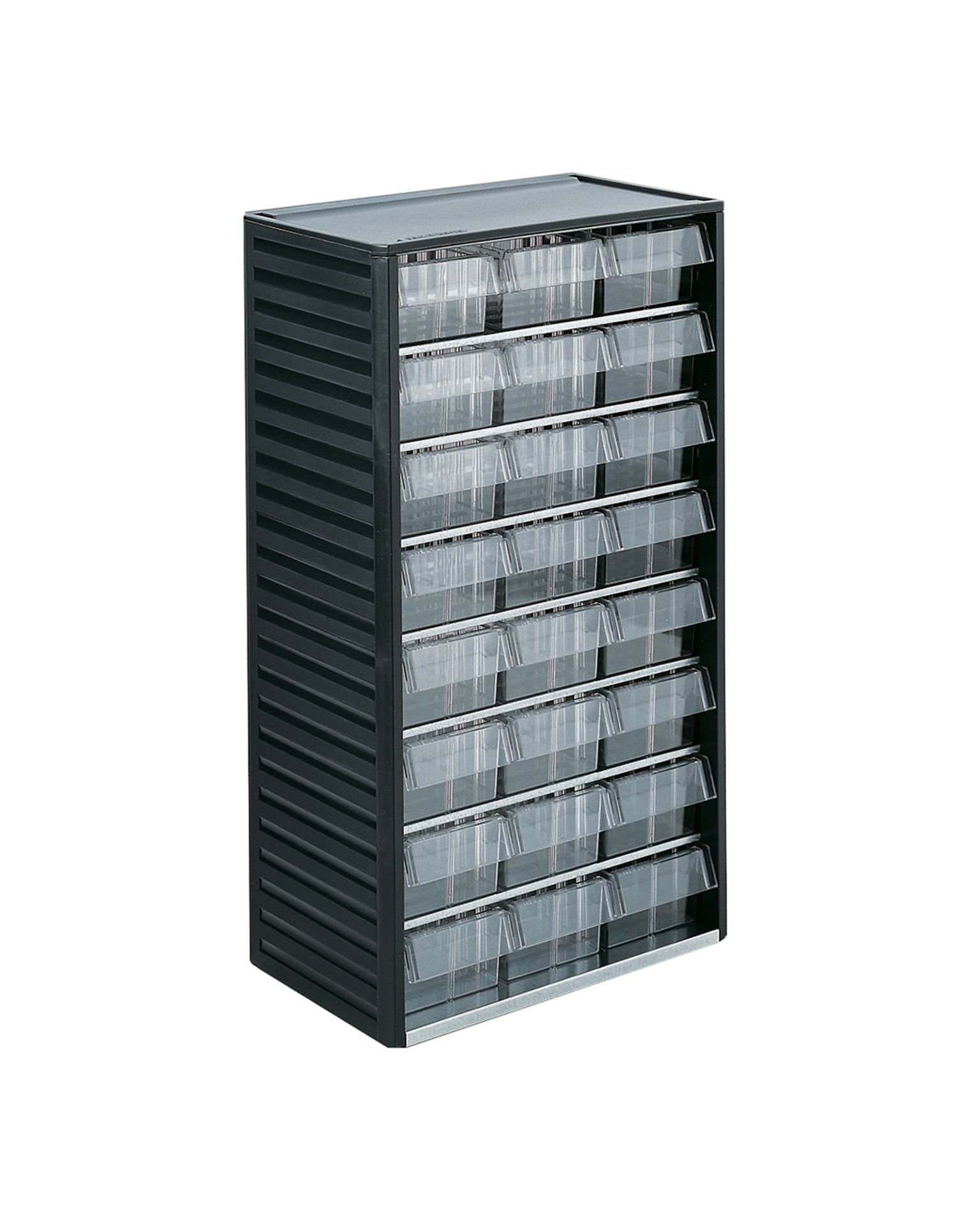 Små förvaringslådor av hög kvalitet för professionellt bruk. Lådställen kan ställas på ett bord, skruvas fast på väggen, staplas på svängbara ställ eller på lådställ. Ram i formgjuten polypropen, hyllplan i galvaniserad stålplåt, lådor i klar polystyren.