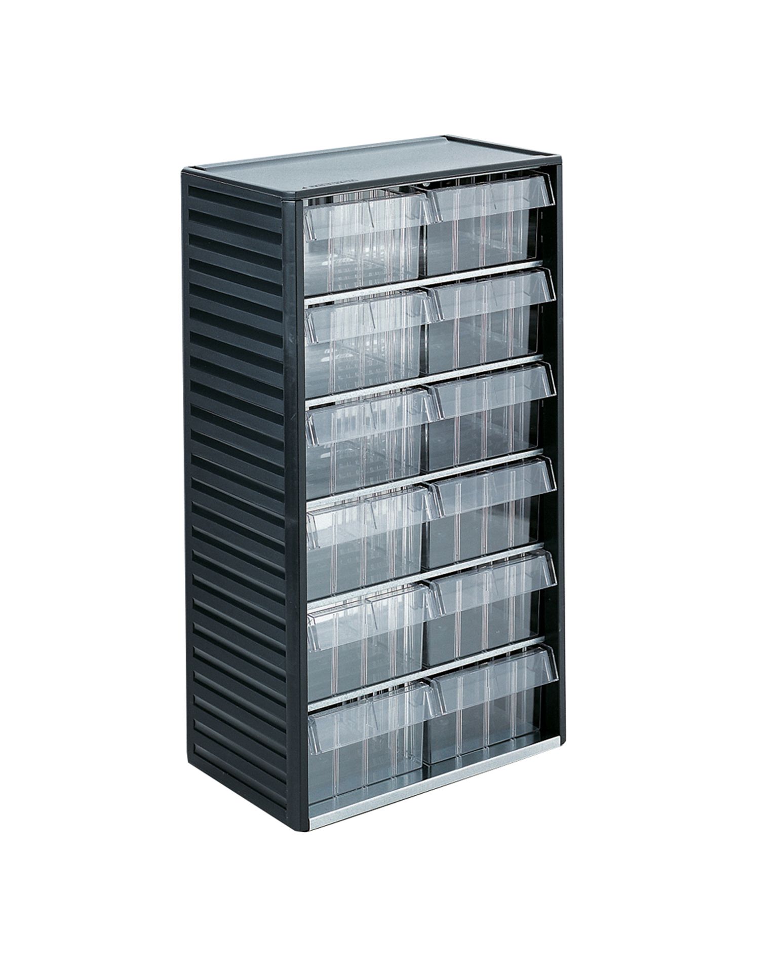 Små förvaringslådor av hög kvalitet för professionellt bruk. Lådställen kan ställas på ett bord, skruvas fast på väggen, staplas på svängbara ställ eller på lådställ. Ram i formgjuten polypropen, hyllplan i galvaniserad stålplåt, lådor i klar polystyren.