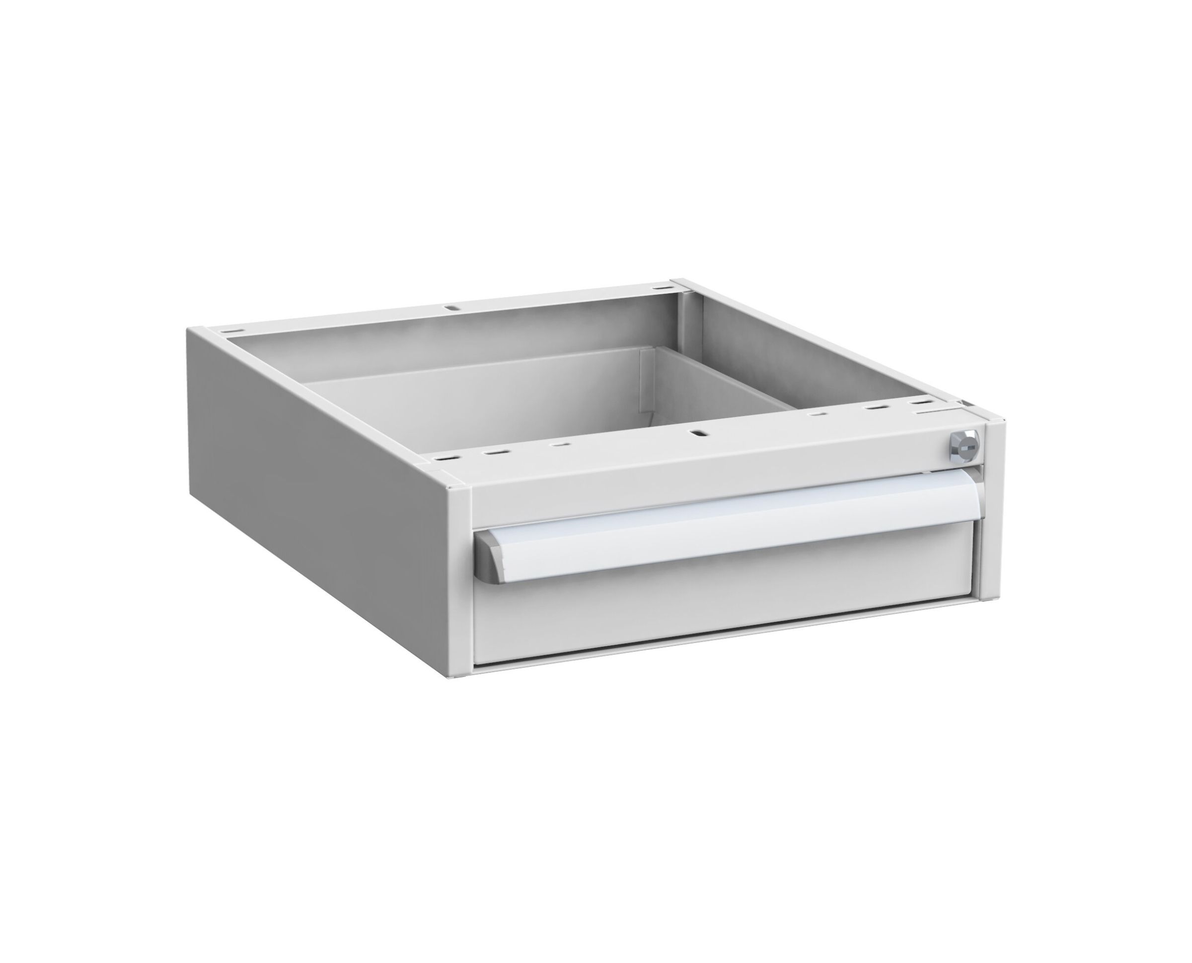 Låsbara stålboxar för hushållsbruk. Kan fästas under bänkskivan. Lådan med lock fungerar som en enda låda med hjul. Centrallås, långt drag i anodiserad aluminium. Teleskopskenorna på lådorna öppnas smidigt. Lådorna med 100% öppning har en lastkapacitet på 60 kg per låda. Lådorna är också lämpliga för användning i EPA-området. Tillverkad av pulverlackerat stål i grått. Färg grå RAL7035.