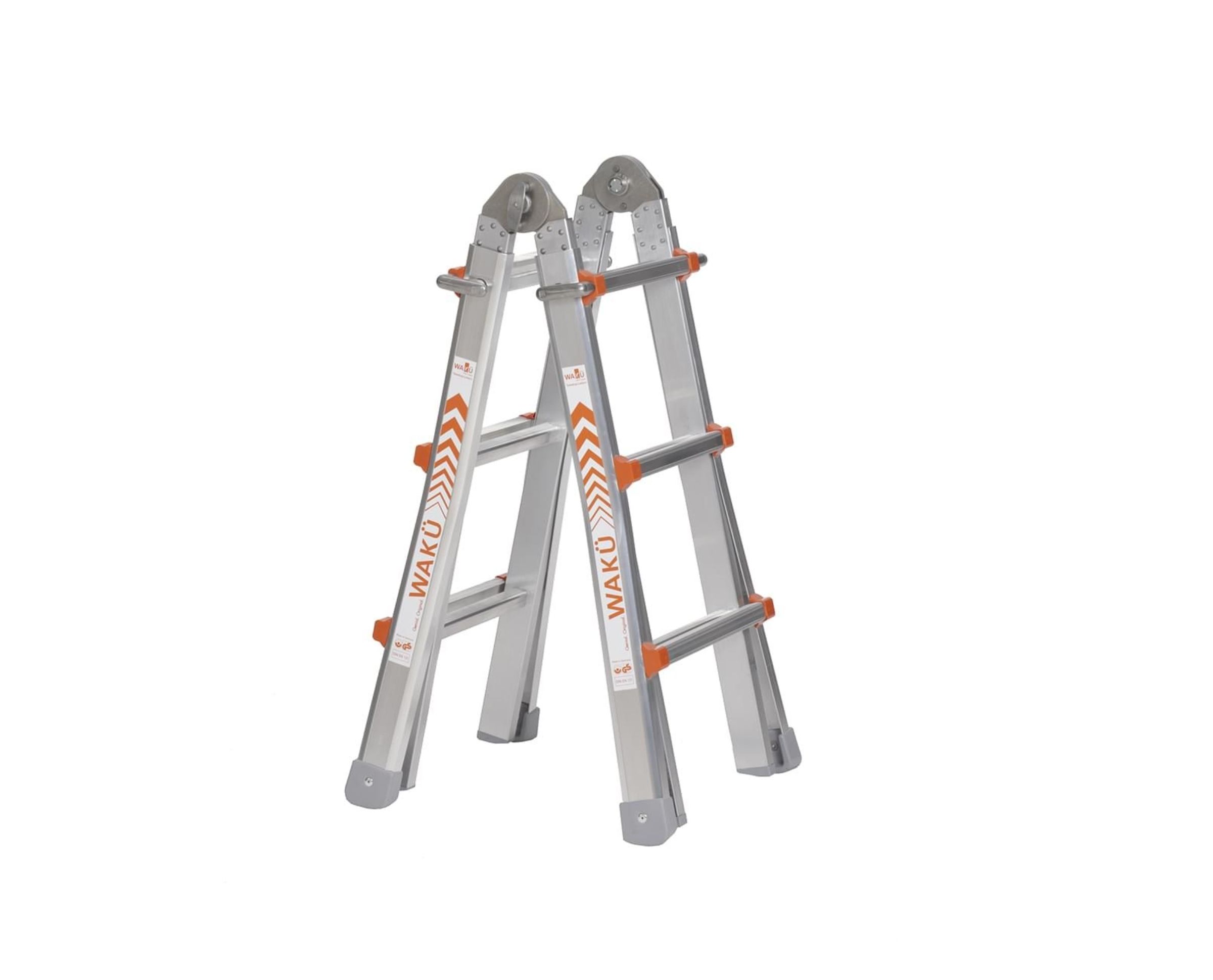 Mångsidiga och hållbara Waku-stegar, som enkelt kan omvandlas till teleskopstegar, A-ramar eller trappstegar, beroende på dina behov. Stegen är konstruerad med högkvalitativa material, noggrant utformade detaljer och en design som främjar säkerhet och komfort. Halkfria fötter i hårt gummi ger ett fast grepp på olika underlag och förhindrar skador på golvet.