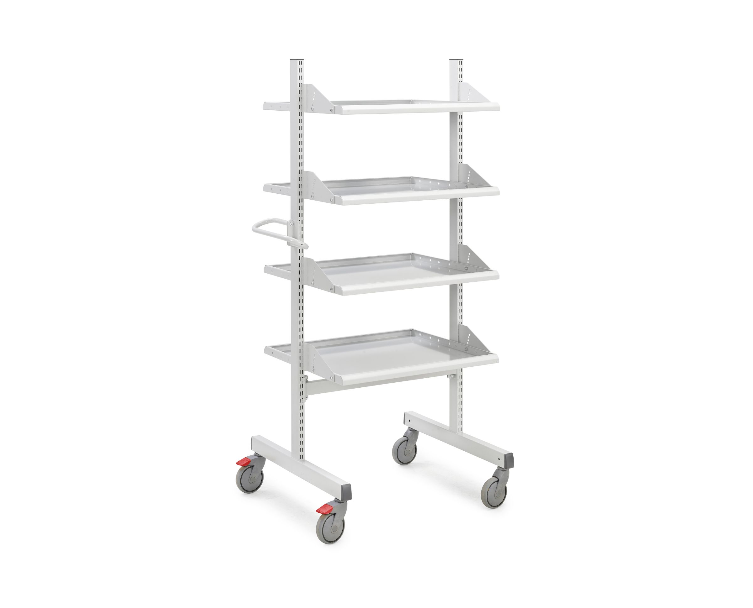 Denna ergonomiska stålvagn med handtag är modulär och kan, tack vare det stora utbudet av utrustning, skräddarsys efter dina behov. Den är t.ex. idealisk för LEAN-produktionsmiljöer. Vagnen är lätt att skjuta och fungerar bra som t.ex. verktygsvagn. Fyra svängbara hjul (Ø 125 mm), varav två är bromsade. Pulverlackerad (RAL 7035). Total lastkapacitet 300 kg. Vagnen kan användas för pick-up-lådor, olika typer av hyllor och hålkort och kan även utrustas med ett hålkortsskåp. Vissa kombinationer kan även fås med ESD-skydd.