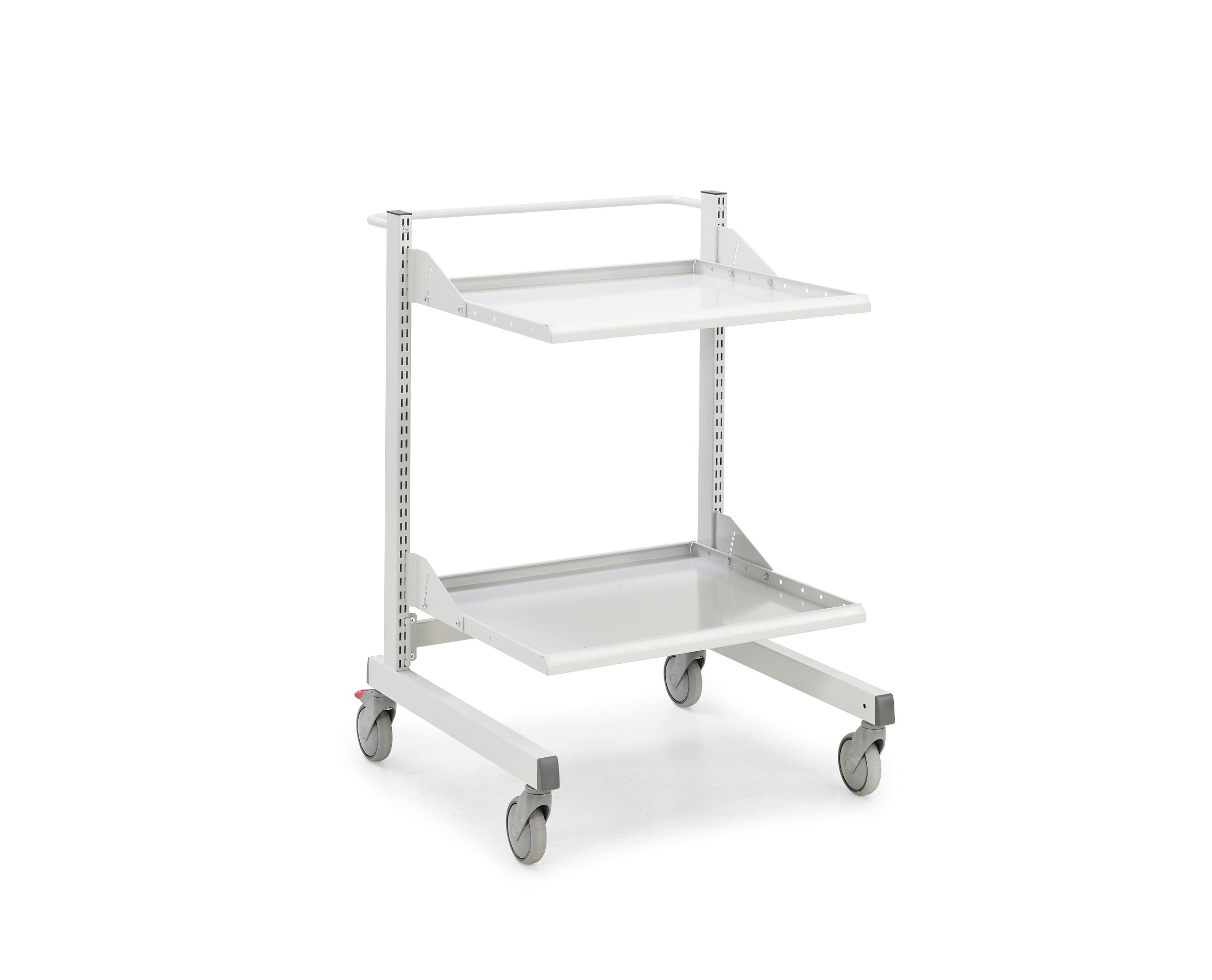 Denna ergonomiska stålvagn med handtag är modulär och kan, tack vare det stora utbudet av utrustning, skräddarsys efter dina behov. Den är t.ex. idealisk för LEAN-produktionsmiljöer. Vagnen är lätt att skjuta och fungerar bra som t.ex. verktygsvagn. Fyra svängbara hjul (Ø 125 mm), varav två är bromsade. Pulverlackerad (RAL 7035). Total lastkapacitet 300 kg. Vagnen kan användas för pick-up-lådor, olika typer av hyllor och hålkort och kan även utrustas med ett hålkortsskåp. Vissa kombinationer kan även fås med ESD-skydd.
